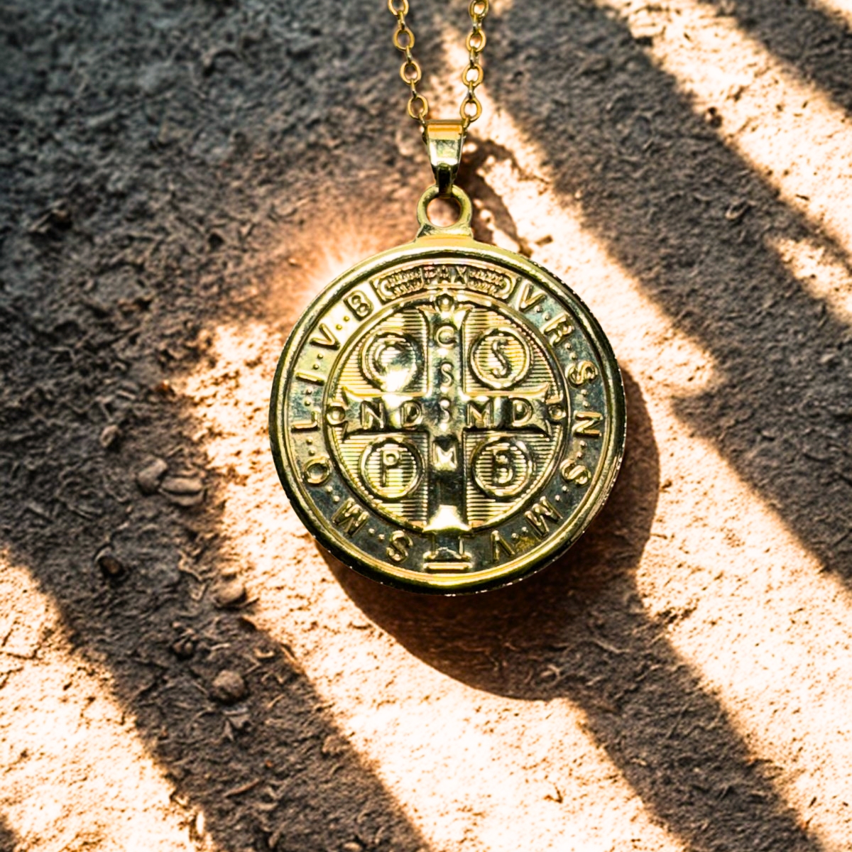 Símbolo tradicional de proteção e fé, essa medalha de São Bento banhada a ouro une significado espiritual com elegância.